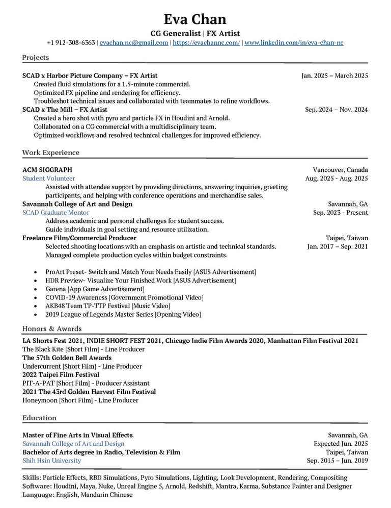 I am an aspiring CG Generalist and FX artist pursuing an MFA at SCAD, with a solid foundation in film and television from my bachelor's studies in Taiwan. My journey began in directing and producing, but I’ve since transitioned to focus on 3D artistry, aiming to bring captivating visuals to life in both film and commercial projects.