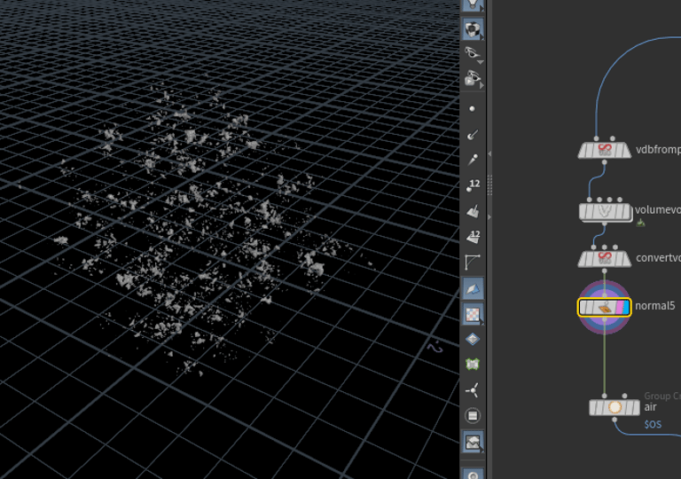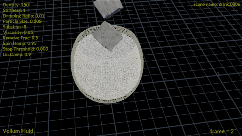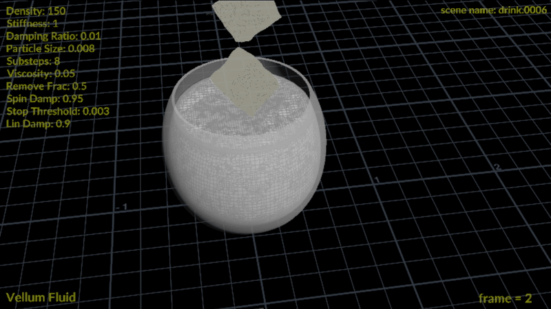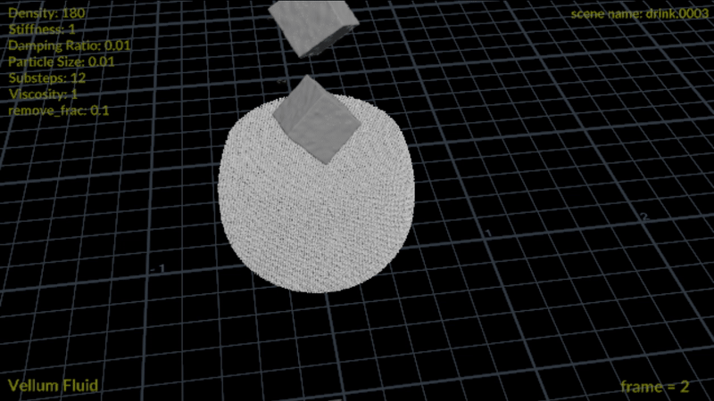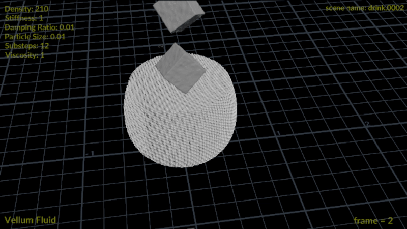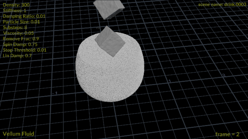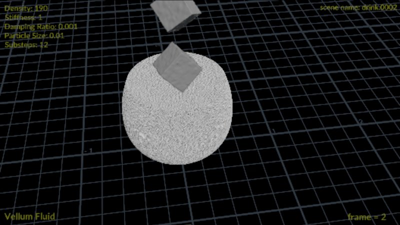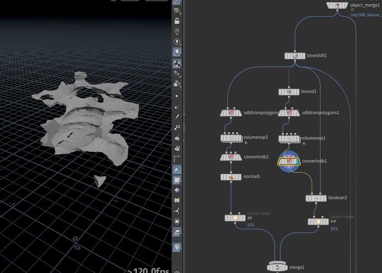 Next, I chose to use the Vellum Solver to simulate the interaction between the ice cube and the fluid. You can see the basic setup for the Vellum fluid simulation here.