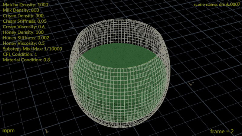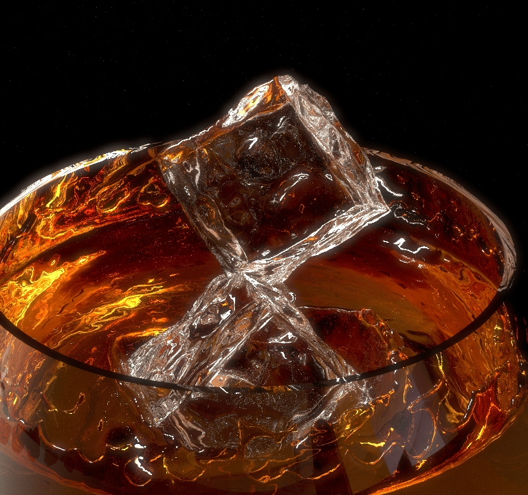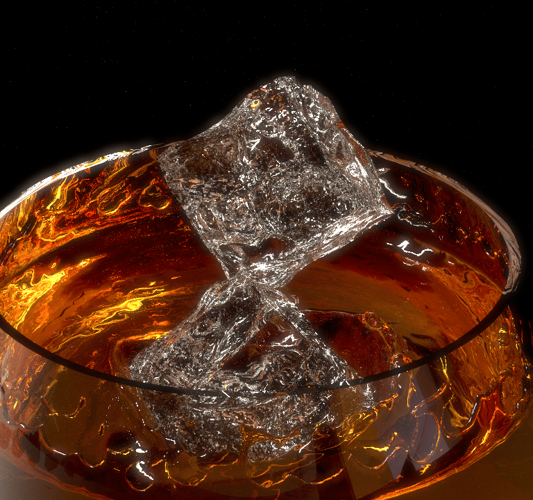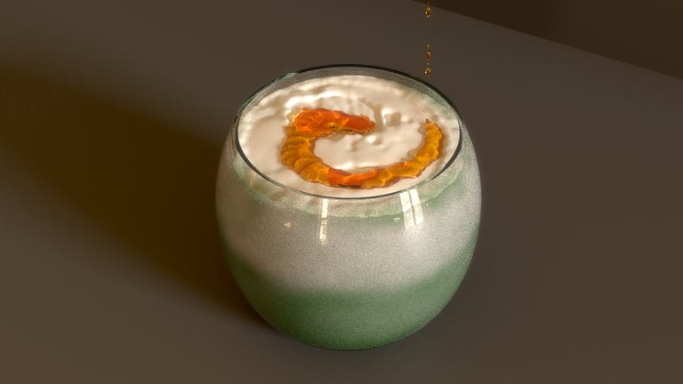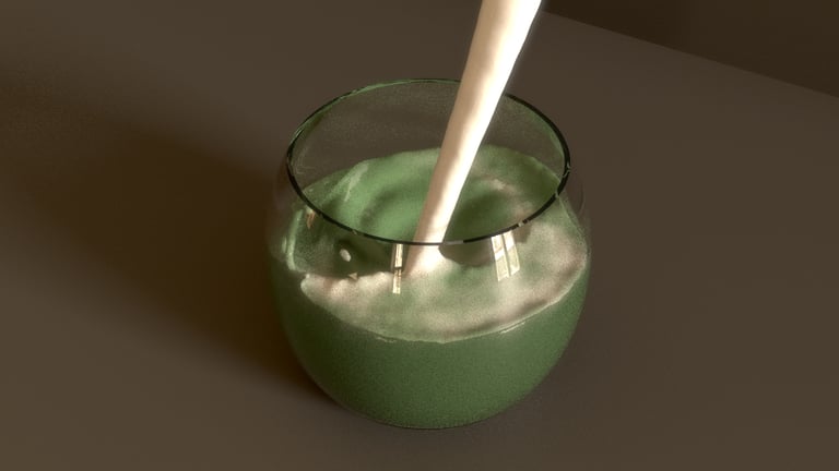 For this project, I plan to experiment with two simulations: one showing an ice cube dropping into a glass of whiskey, and another creating a matcha latte with four different components: matcha, milk, cream, and honey.