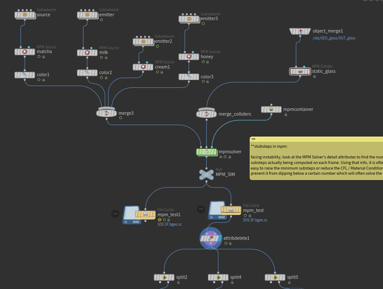 Next, I wanted to use the MPM Solver to simulate four different substances together — matcha, milk, cream, and honey. The MPM method is very efficient because you can feed all these sources into a single MPM Source connected to one solver.