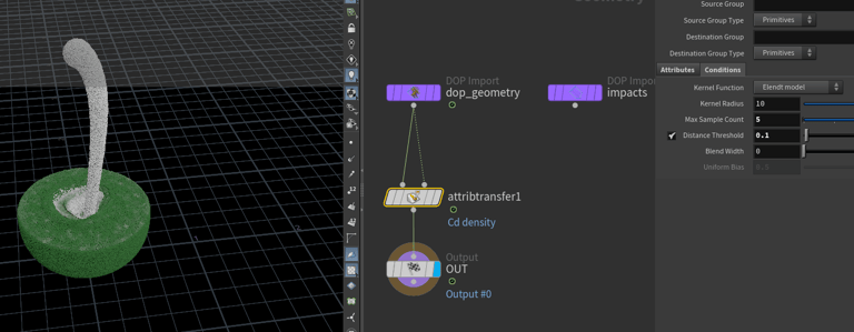 By adjusting the Max Sample Count and Distance Threshold parameters in the Attribute Transfer node, I was able to control how smoothly the colors and densities blended.