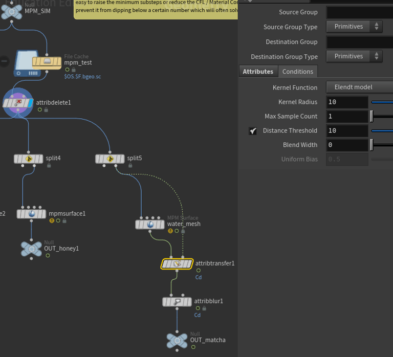 To blend two fluids of different colors in the MPM Solver, I utilized a SOP Solver within DOPs. In the SOP Solver, I brought in the DOP geometry and used an Attribute Transfer node to transfer both @Cd (color) and @density between the two fluid sources.