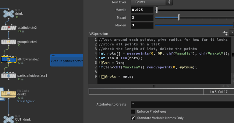 After obtaining a simulation result I liked, I wanted to clean up the particles before converting them into a fluid surface to avoid any strange or messy mesh shapes. I used the following Attribute Wrangle code to remove unnecessary or isolated particles.