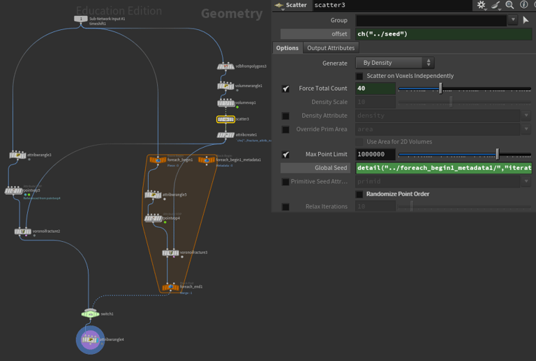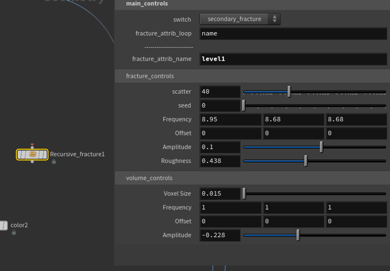 The reason I used an HDA is that I wanted to create multiple levels of fractures and control each level individually, as well as create interesting edges for the fractures. Since using the name attribute would cause overlaps, I created a new attribute after the Scatter node. This new attribute is then passed through the For-Each loop, where it gets used in each iteration. To make the setup more manageable, I added parameters at the top level, allowing me to control them easily.